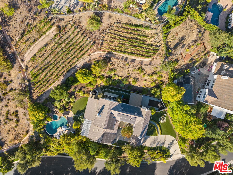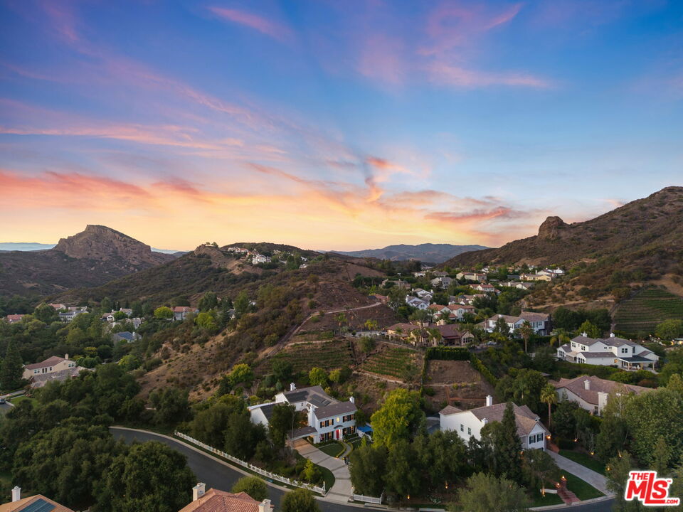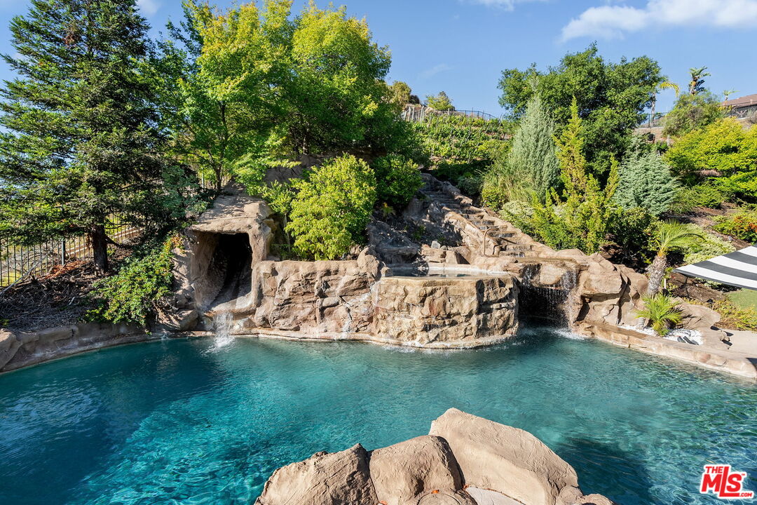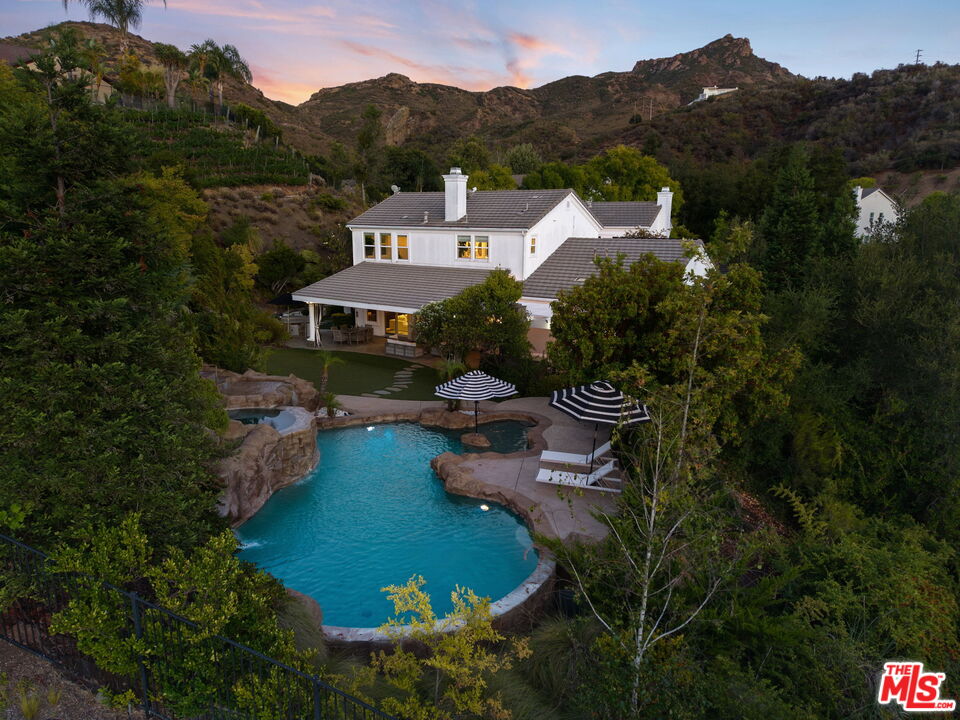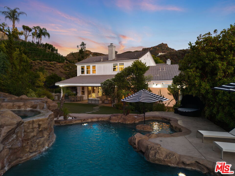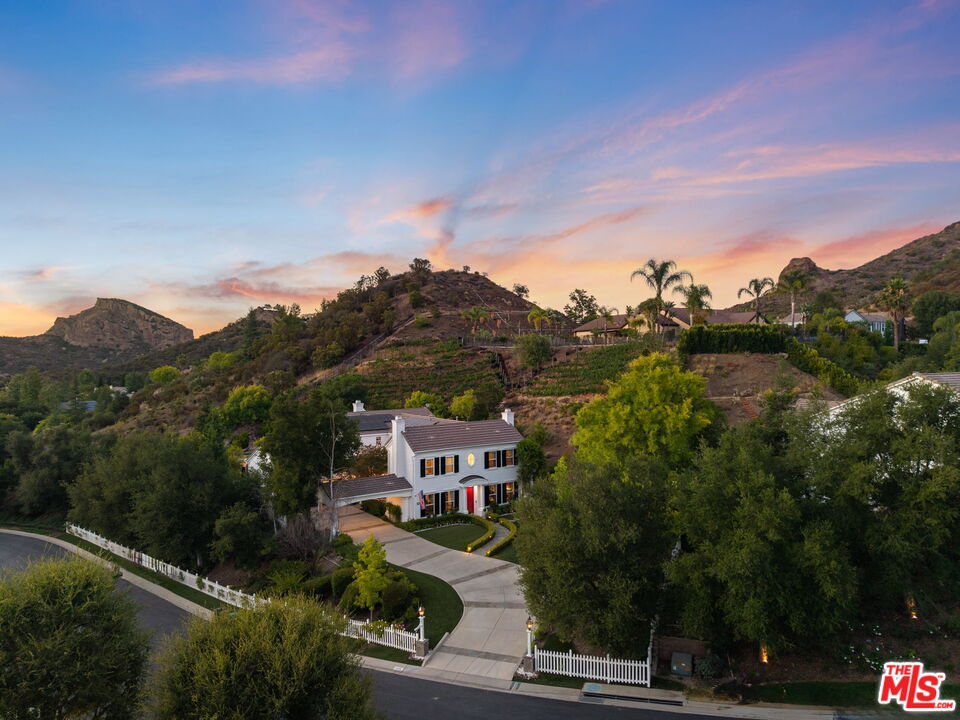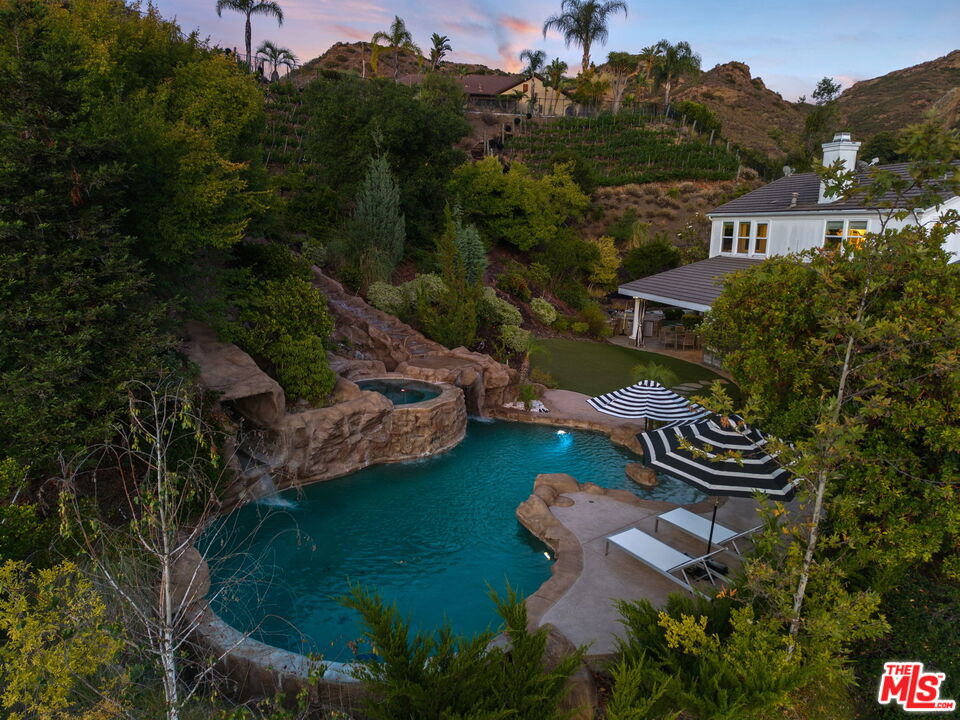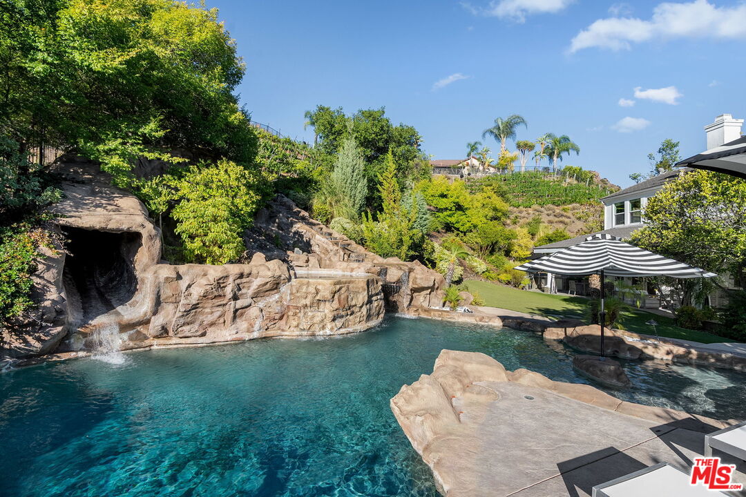 Welcome to a truly one-of-a-kind entertainer's paradise, ideally located in the heart of Westlake Village, one of Southern California's most coveted communities, celebrated for its top-rated schools and relaxed, upscale lifestyle. Set within a prestigious guard-gated neighborhood, this exceptional residence masterfully blends luxury, comfort, and show-stopping amenities throughout. At the heart of the home is a designer-remodeled kitchen featuring a breathtaking 13-foot Brazilian white marble island crafted from a single slab, paired with high-end appliances, including a Viking range with griddle and indoor grill, and a Halo 5 full-house water filtration system. The elegant interior also boasts a formal dining room with a fireplace, a fully enclosed office, an expansive primary suite with a peaceful seating area, a designer remodeled primary bathroom, a massive walk-in closet, and captivating views. Each bedroom is en suite and thoughtfully appointed with custom-built closets and dressers, offering refined style and everyday functionality. Step outside to your own private resort, where a large pool with a 40-foot waterslide, swim-up cave, and oversized jacuzzi takes center stage. Incredible canyon and hillside views can be seen from many vantage points of the expansive backyard. The outdoor amenities continue with three distinctive covered patios, a sports court, a wood-burning outdoor fireplace, and a side yard play area with artificial turf. The main backyard living space is an entertainer's dreamfully equipped with a TV, prep islands, sleek cabinetry, and a built-in barbecue and bar, ideal for gatherings of any size. A peaceful enclosed courtyard with a fire pit adds an intimate touch, while your very own Cabernet vineyard produces up to 400 bottles annually, creating a rare and luxurious lifestyle experience. Additional highlights include paid-off solar panels, a Tesla charger, a steam shower in the primary suite, low-maintenance artificial turf landscaping, a laundry room with a brand-new front-loading washer and dryer, and a climate-controlled wine cabinet capable of storing over 400 bottles. This extraordinary estate is the ultimate expression of luxury living in Westlake Village and must be seen to be fully appreciated. Don't miss your chance to tour this one-of-a-kind home before it's gone.