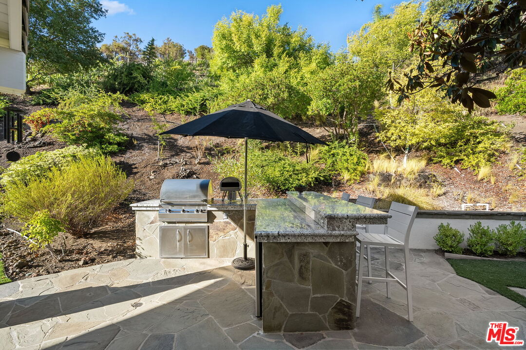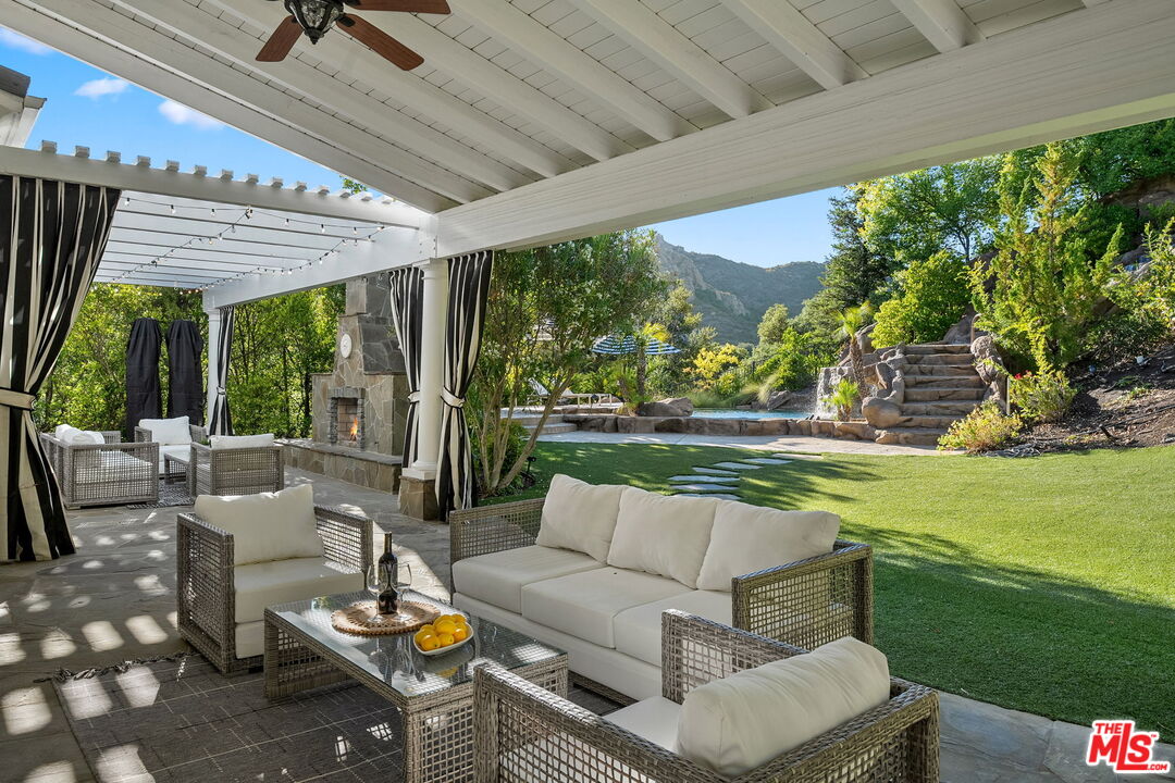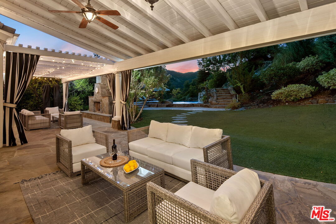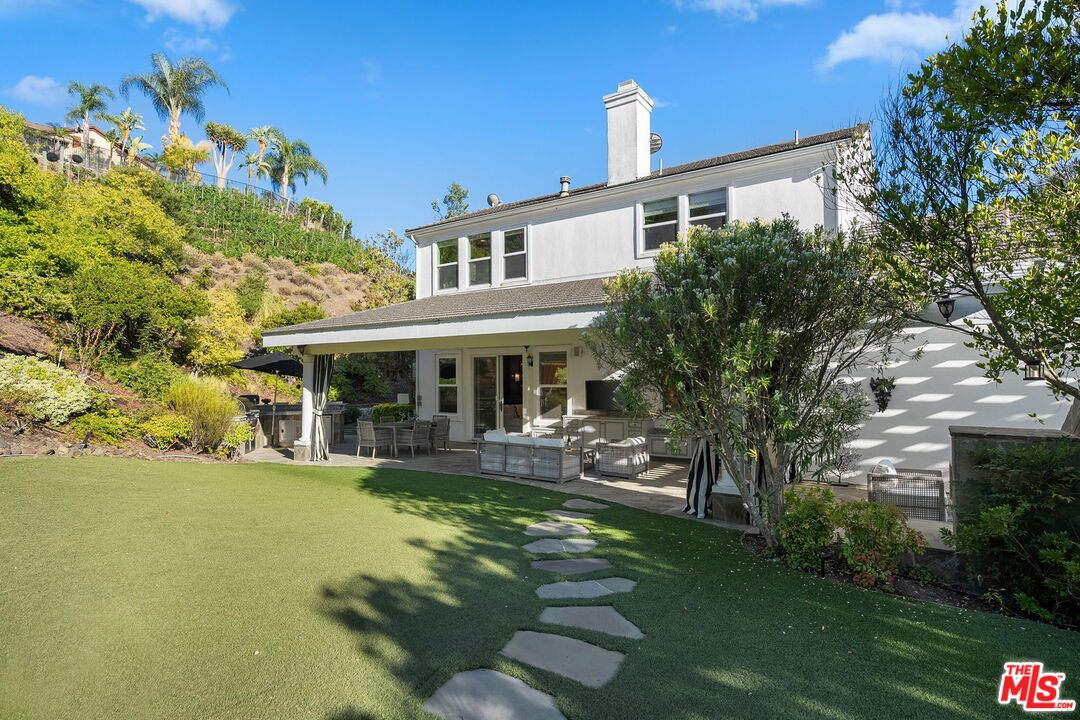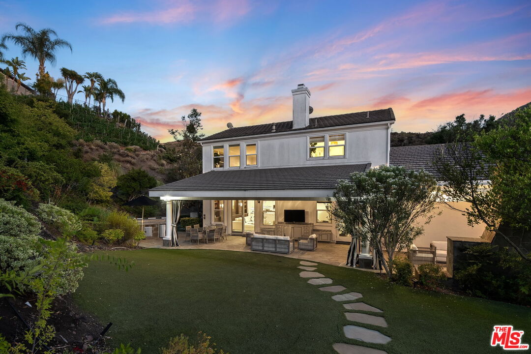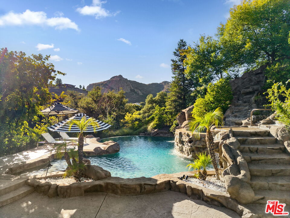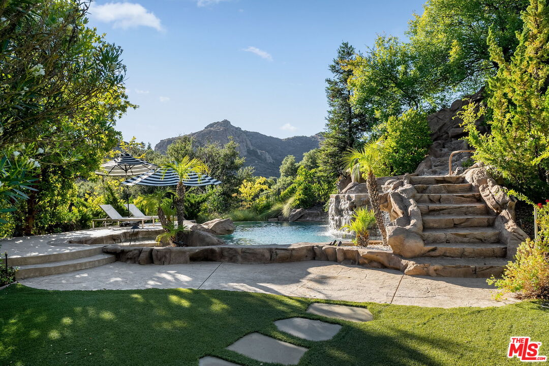 Welcome to a truly one-of-a-kind entertainer's paradise, ideally located in the heart of Westlake Village, one of Southern California's most coveted communities, celebrated for its top-rated schools and relaxed, upscale lifestyle. Set within a prestigious guard-gated neighborhood, this exceptional residence masterfully blends luxury, comfort, and show-stopping amenities throughout. At the heart of the home is a designer-remodeled kitchen featuring a breathtaking 13-foot Brazilian white marble island crafted from a single slab, paired with high-end appliances, including a Viking range with griddle and indoor grill, and a Halo 5 full-house water filtration system. The elegant interior also boasts a formal dining room with a fireplace, a fully enclosed office, an expansive primary suite with a peaceful seating area, a designer remodeled primary bathroom, a massive walk-in closet, and captivating views. Each bedroom is en suite and thoughtfully appointed with custom-built closets and dressers, offering refined style and everyday functionality. Step outside to your own private resort, where a large pool with a 40-foot waterslide, swim-up cave, and oversized jacuzzi takes center stage. Incredible canyon and hillside views can be seen from many vantage points of the expansive backyard. The outdoor amenities continue with three distinctive covered patios, a sports court, a wood-burning outdoor fireplace, and a side yard play area with artificial turf. The main backyard living space is an entertainer's dreamfully equipped with a TV, prep islands, sleek cabinetry, and a built-in barbecue and bar, ideal for gatherings of any size. A peaceful enclosed courtyard with a fire pit adds an intimate touch, while your very own Cabernet vineyard produces up to 400 bottles annually, creating a rare and luxurious lifestyle experience. Additional highlights include paid-off solar panels, a Tesla charger, a steam shower in the primary suite, low-maintenance artificial turf landscaping, a laundry room with a brand-new front-loading washer and dryer, and a climate-controlled wine cabinet capable of storing over 400 bottles. This extraordinary estate is the ultimate expression of luxury living in Westlake Village and must be seen to be fully appreciated. Don't miss your chance to tour this one-of-a-kind home before it's gone.