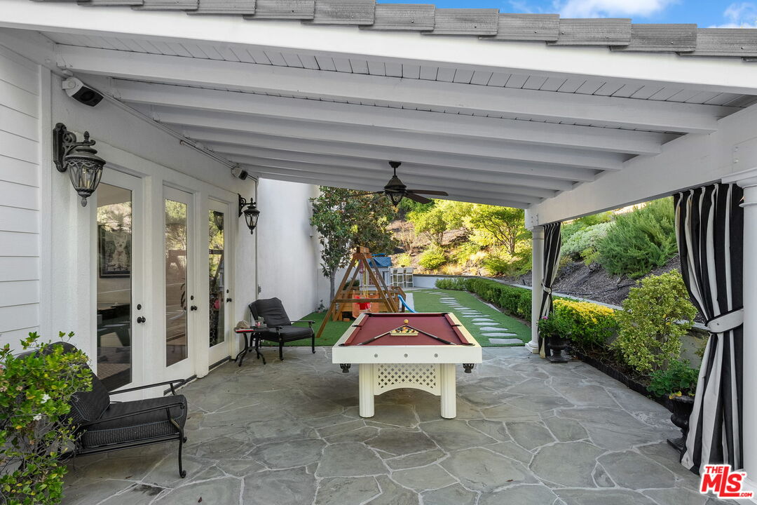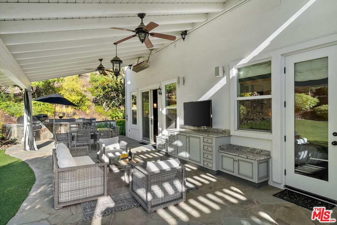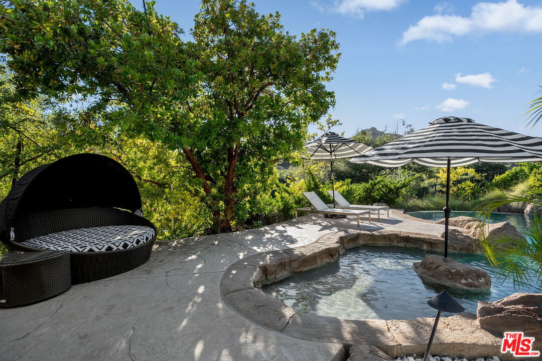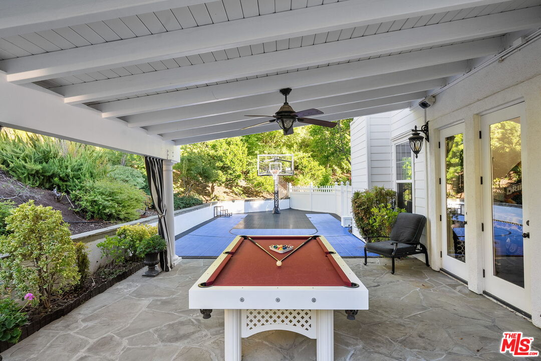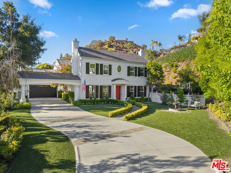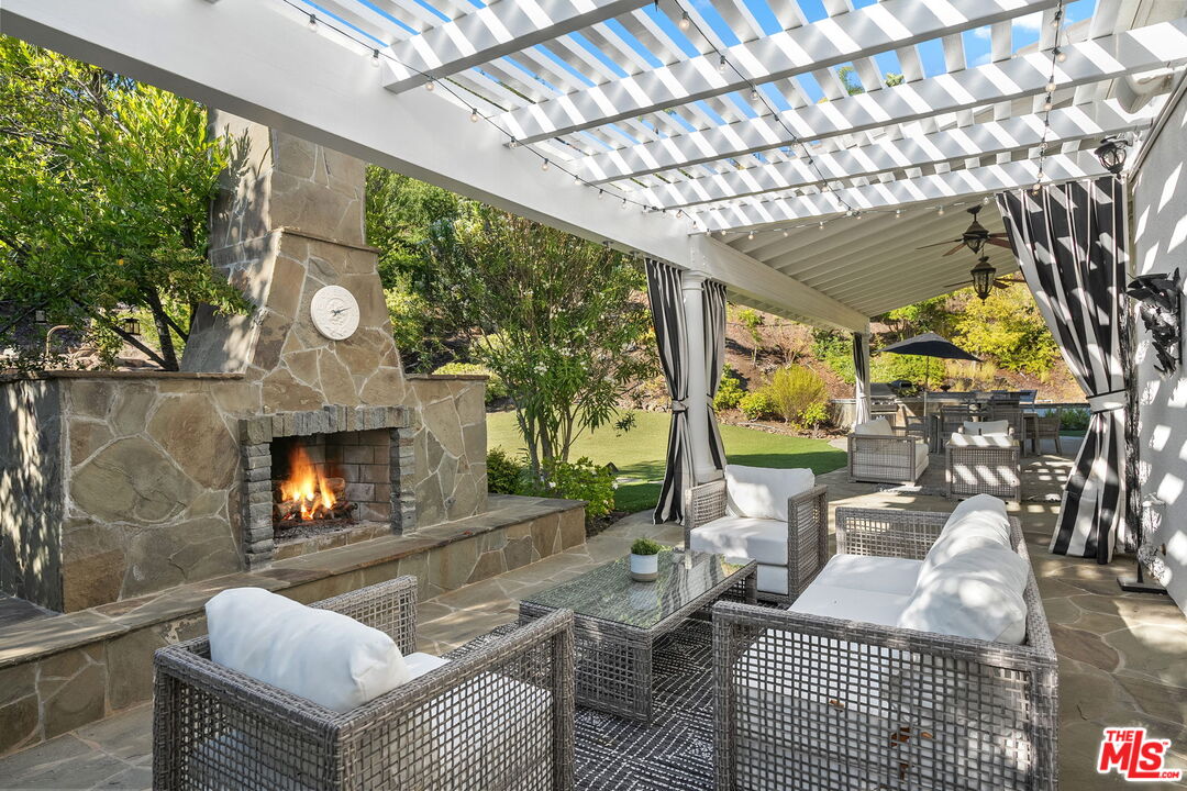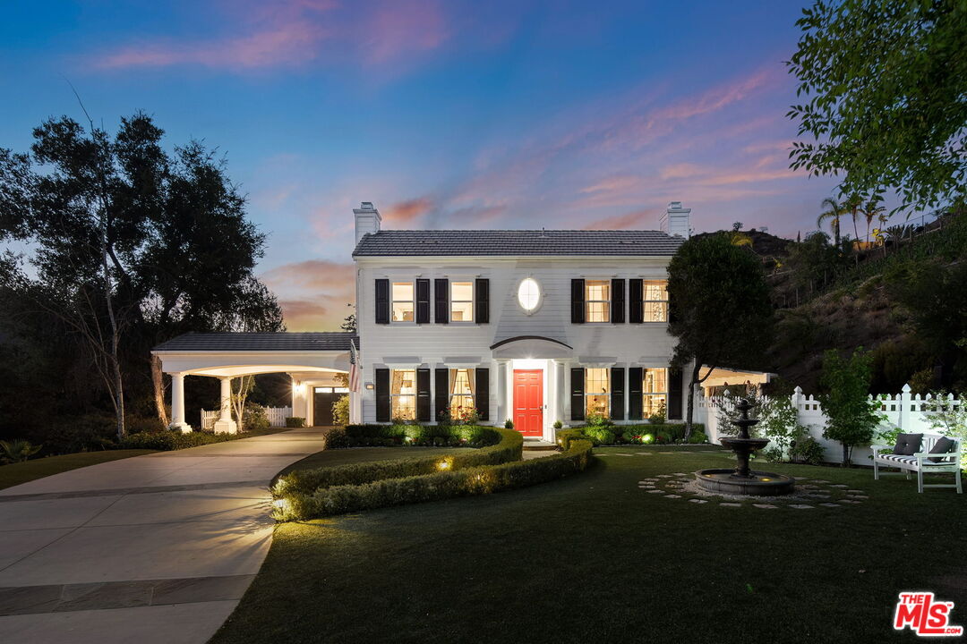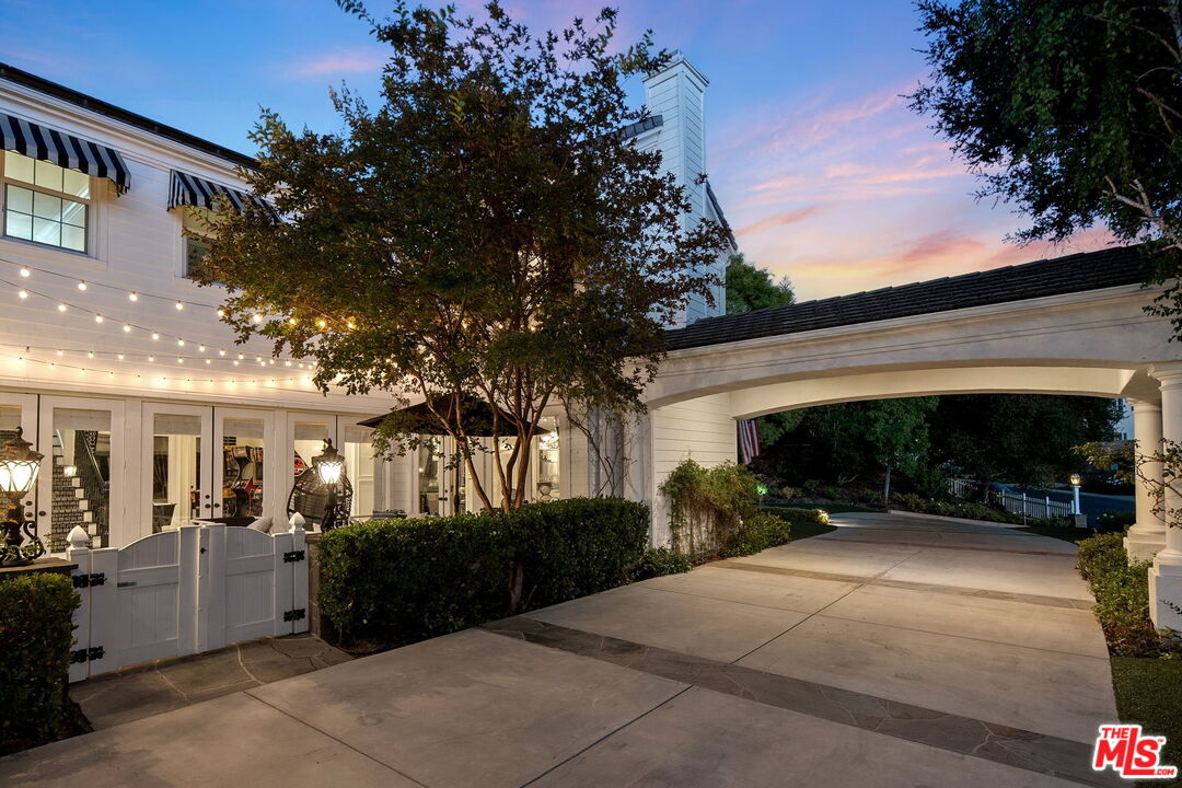 Welcome to a truly one-of-a-kind entertainer's paradise, ideally located in the heart of Westlake Village, one of Southern California's most coveted communities, celebrated for its top-rated schools and relaxed, upscale lifestyle. Set within a prestigious guard-gated neighborhood, this exceptional residence masterfully blends luxury, comfort, and show-stopping amenities throughout. At the heart of the home is a designer-remodeled kitchen featuring a breathtaking 13-foot Brazilian white marble island crafted from a single slab, paired with high-end appliances, including a Viking range with griddle and indoor grill, and a Halo 5 full-house water filtration system. The elegant interior also boasts a formal dining room with a fireplace, a fully enclosed office, an expansive primary suite with a peaceful seating area, a designer remodeled primary bathroom, a massive walk-in closet, and captivating views. Each bedroom is en suite and thoughtfully appointed with custom-built closets and dressers, offering refined style and everyday functionality. Step outside to your own private resort, where a large pool with a 40-foot waterslide, swim-up cave, and oversized jacuzzi takes center stage. Incredible canyon and hillside views can be seen from many vantage points of the expansive backyard. The outdoor amenities continue with three distinctive covered patios, a sports court, a wood-burning outdoor fireplace, and a side yard play area with artificial turf. The main backyard living space is an entertainer's dreamfully equipped with a TV, prep islands, sleek cabinetry, and a built-in barbecue and bar, ideal for gatherings of any size. A peaceful enclosed courtyard with a fire pit adds an intimate touch, while your very own Cabernet vineyard produces up to 400 bottles annually, creating a rare and luxurious lifestyle experience. Additional highlights include paid-off solar panels, a Tesla charger, a steam shower in the primary suite, low-maintenance artificial turf landscaping, a laundry room with a brand-new front-loading washer and dryer, and a climate-controlled wine cabinet capable of storing over 400 bottles. This extraordinary estate is the ultimate expression of luxury living in Westlake Village and must be seen to be fully appreciated. Don't miss your chance to tour this one-of-a-kind home before it's gone.