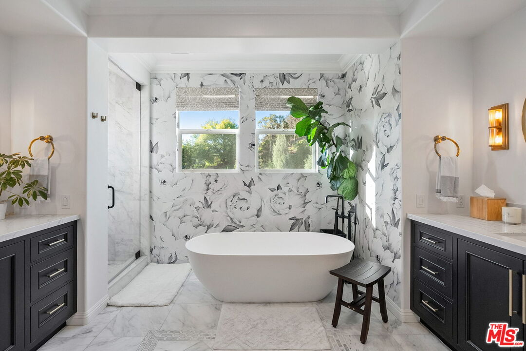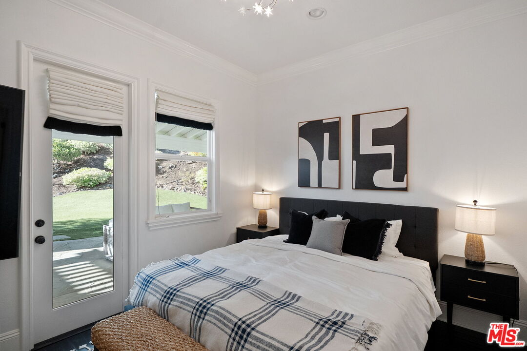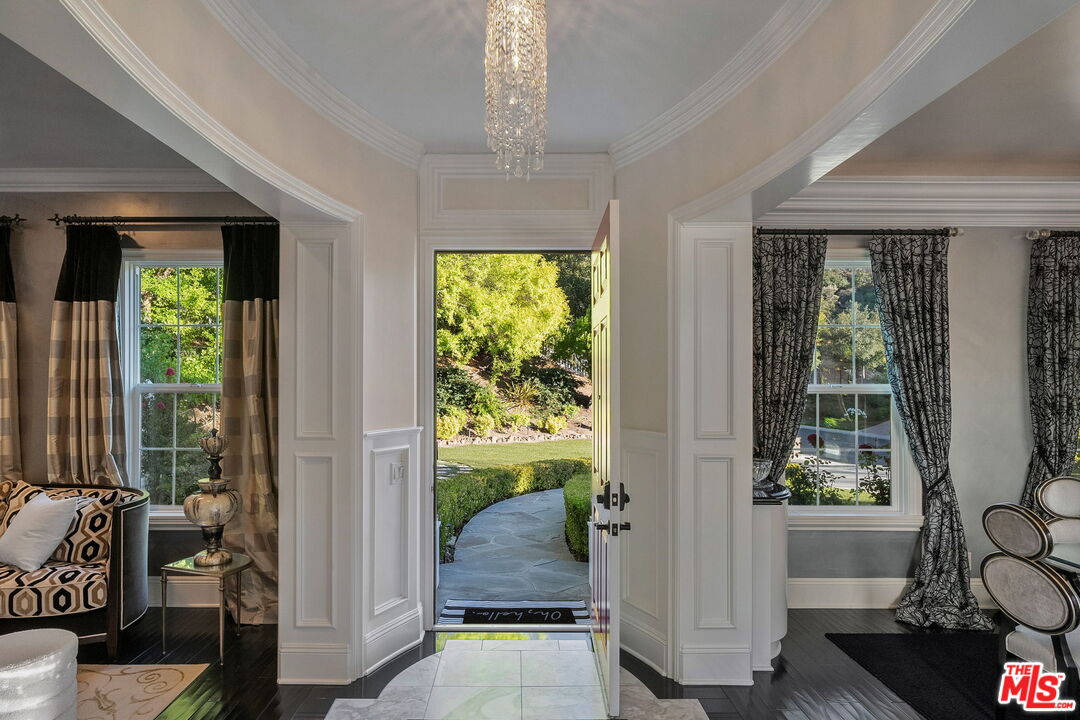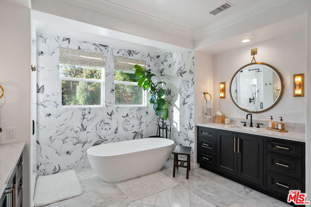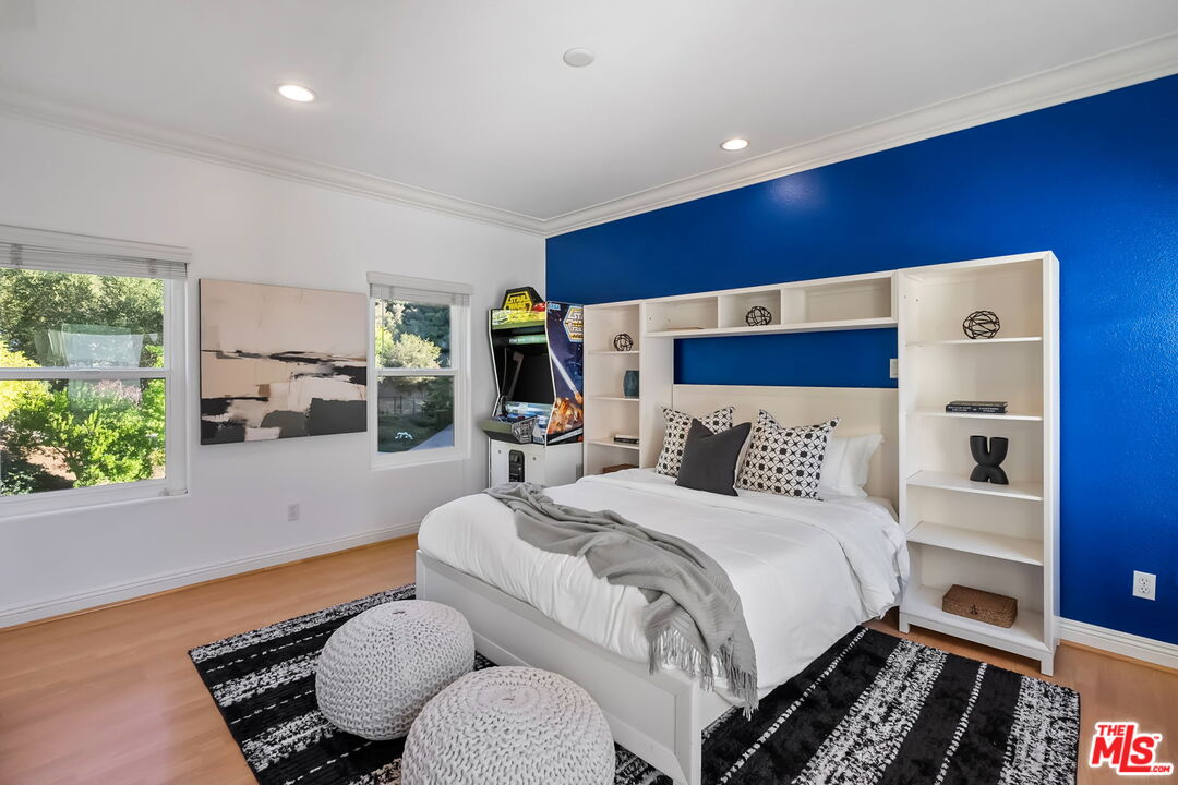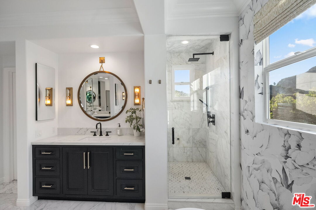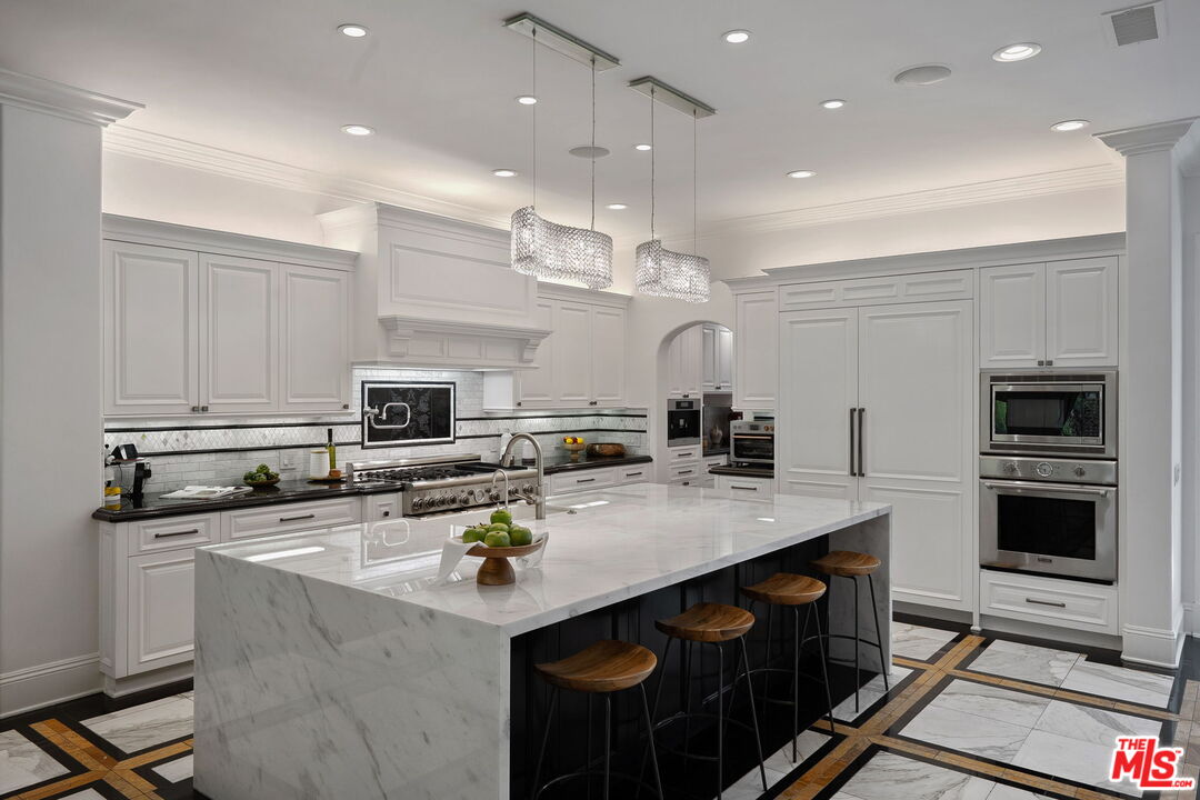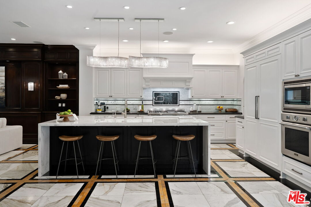 Welcome to a truly one-of-a-kind entertainer's paradise, ideally located in the heart of Westlake Village, one of Southern California's most coveted communities, celebrated for its top-rated schools and relaxed, upscale lifestyle. Set within a prestigious guard-gated neighborhood, this exceptional residence masterfully blends luxury, comfort, and show-stopping amenities throughout. At the heart of the home is a designer-remodeled kitchen featuring a breathtaking 13-foot Brazilian white marble island crafted from a single slab, paired with high-end appliances, including a Viking range with griddle and indoor grill, and a Halo 5 full-house water filtration system. The elegant interior also boasts a formal dining room with a fireplace, a fully enclosed office, an expansive primary suite with a peaceful seating area, a designer remodeled primary bathroom, a massive walk-in closet, and captivating views. Each bedroom is en suite and thoughtfully appointed with custom-built closets and dressers, offering refined style and everyday functionality. Step outside to your own private resort, where a large pool with a 40-foot waterslide, swim-up cave, and oversized jacuzzi takes center stage. Incredible canyon and hillside views can be seen from many vantage points of the expansive backyard. The outdoor amenities continue with three distinctive covered patios, a sports court, a wood-burning outdoor fireplace, and a side yard play area with artificial turf. The main backyard living space is an entertainer's dreamfully equipped with a TV, prep islands, sleek cabinetry, and a built-in barbecue and bar, ideal for gatherings of any size. A peaceful enclosed courtyard with a fire pit adds an intimate touch, while your very own Cabernet vineyard produces up to 400 bottles annually, creating a rare and luxurious lifestyle experience. Additional highlights include paid-off solar panels, a Tesla charger, a steam shower in the primary suite, low-maintenance artificial turf landscaping, a laundry room with a brand-new front-loading washer and dryer, and a climate-controlled wine cabinet capable of storing over 400 bottles. This extraordinary estate is the ultimate expression of luxury living in Westlake Village and must be seen to be fully appreciated. Don't miss your chance to tour this one-of-a-kind home before it's gone.